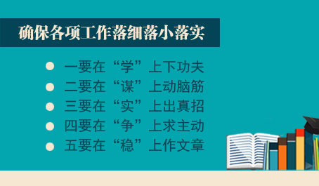 五要在“稳”上作文章。严格落实“安全稳定是硬任务、是第一责任”的要求,按照“属地管理”为主和“谁主管、谁负责”的原则,把安全稳定工作职责和任务落实到位。要抓好意识形态工作。从细微处着手,把握师生思想动态变化,保持广大师生思想统一、人心稳定。要抓好校园安全。加强校园及周边治安综合治理,深入推进安全大检查和隐患排查整改工作。加强校园网贷风险防范和教育引导,让学生远离各类金融陷阱和圈套。要抓好舆论引导。切实提高舆情应对的时效性、有效性,积极运用各类媒体平台,让社会各界和人民群众及时了解教育改革发展的新进展,理解我们面临的矛盾和困难,消除疑虑和误解。教育引导广大师生传播正能量、弘扬主旋律,形成正面舆论场,为教育改革发展营造良好的舆论氛围。